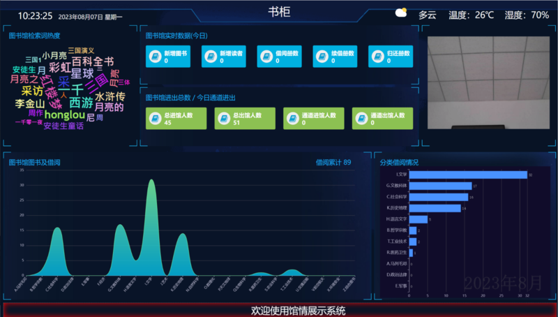 1、图书馆检索词热度:实时展示图书馆内自助查询机读者查询的检索词热度排行。